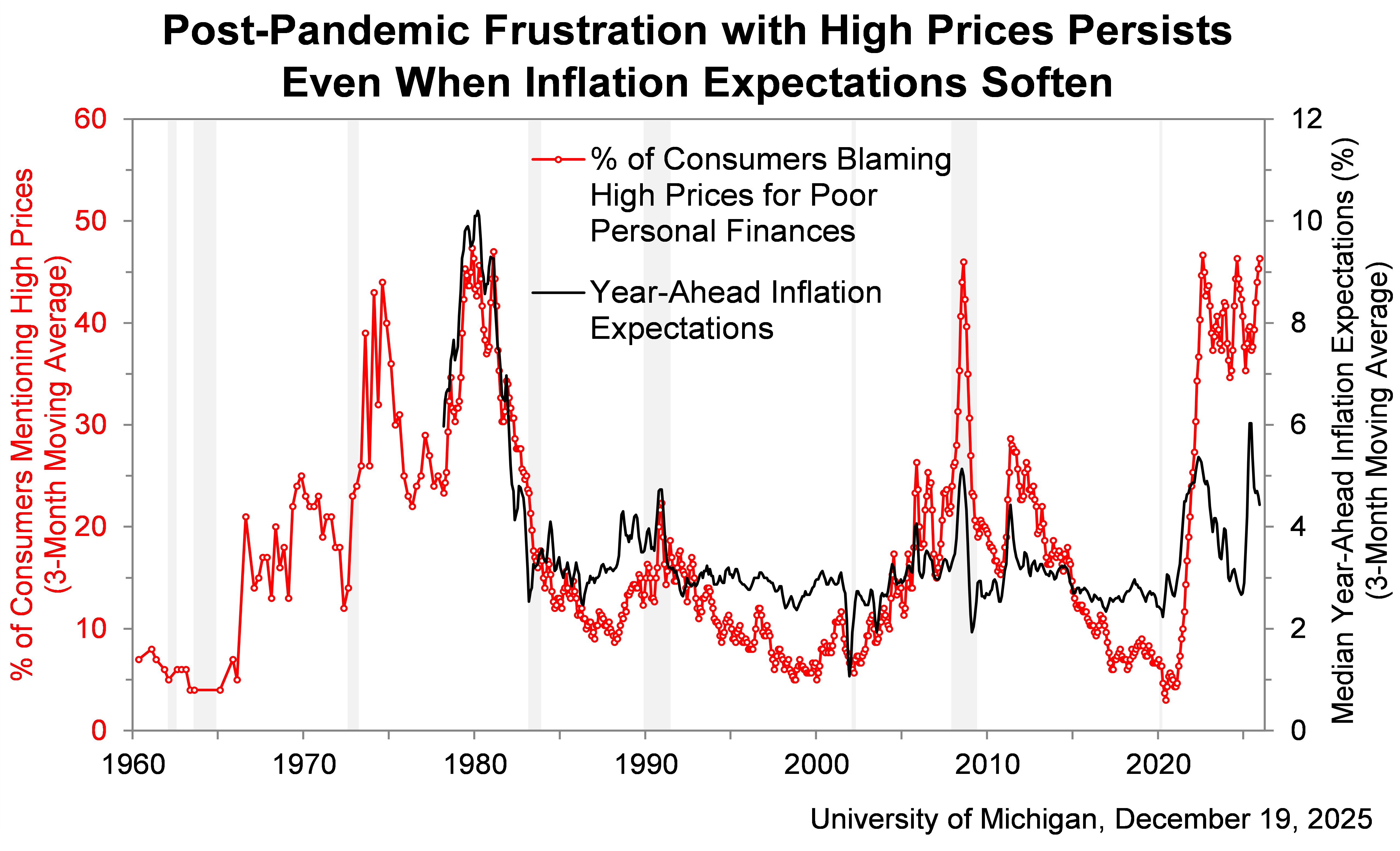 Consumer sentiment confirmed its early month reading, inching up less than two index points from November, within the margin of error. While lower-income consumers posted gains, sentiment for higher-income consumers was little changed. Buying conditions for durable goods fell for the fifth straight month, whereas expectations for personal finances and business conditions rose in December. Labor market expectations lifted a bit this month, though a solid majority of 63% of consumers still expects unemployment to continue rising during the next year. Despite some signs of improvement to close out the year, sentiment remains nearly 30% below December 2024, as pocketbook issues continue to dominate consumer views of the economy.