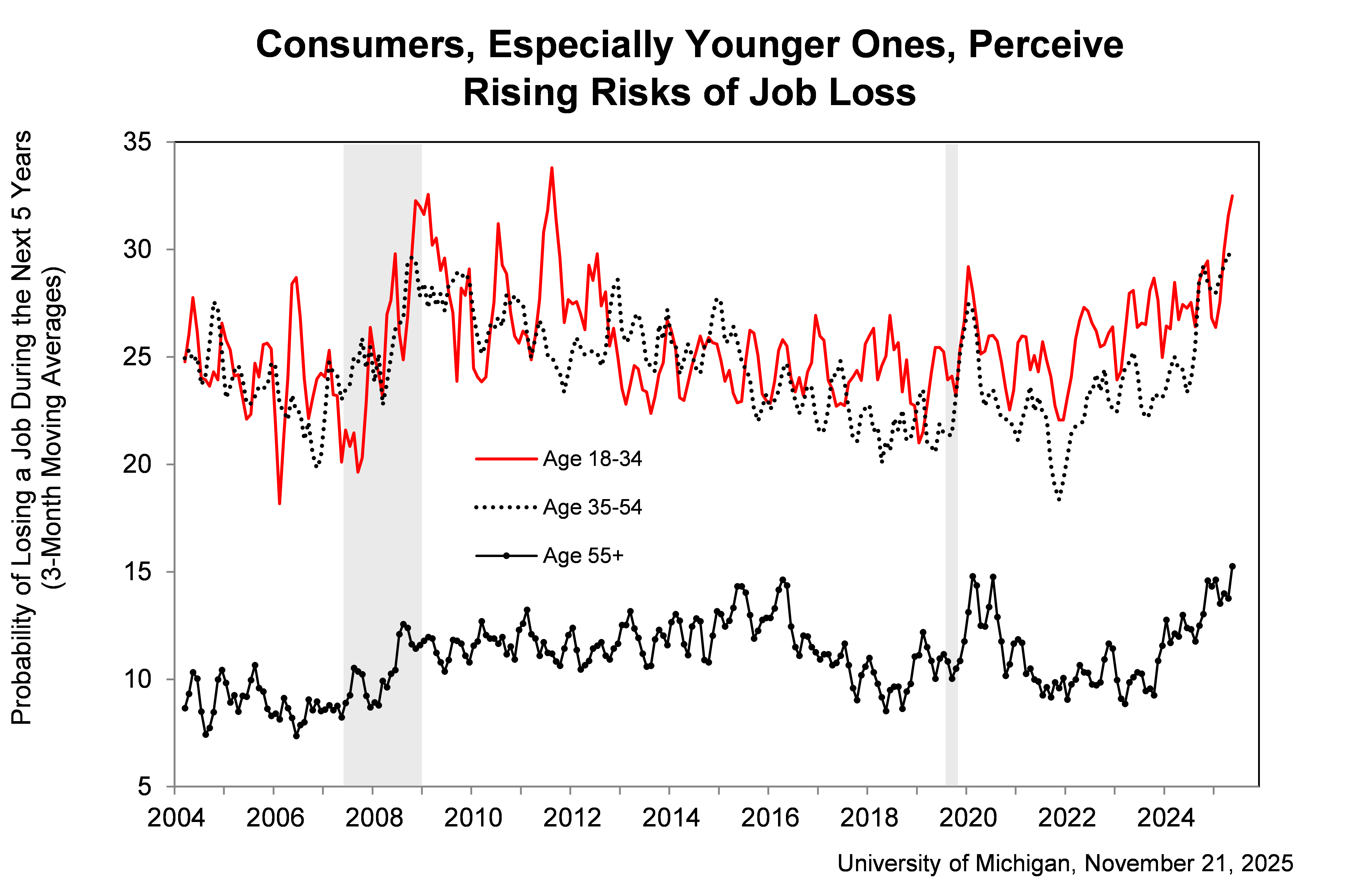 Consumer sentiment was little changed this month with a 2.6 index point decrease from October that is within the margin of error. After the federal shutdown ended, sentiment lifted slightly from its mid-month reading. However, consumers remain frustrated about the persistence of high prices and weakening incomes. This month, current personal finances and buying conditions for durables both plunged more than 10%, whereas expectations for the future improved modestly. By the end of the month, sentiment for consumers with the largest stock holdings lost the gains seen at the preliminary reading. This group’s sentiment dropped about 2 index points from October, likely a consequence of the stock market declines seen over the past two weeks.