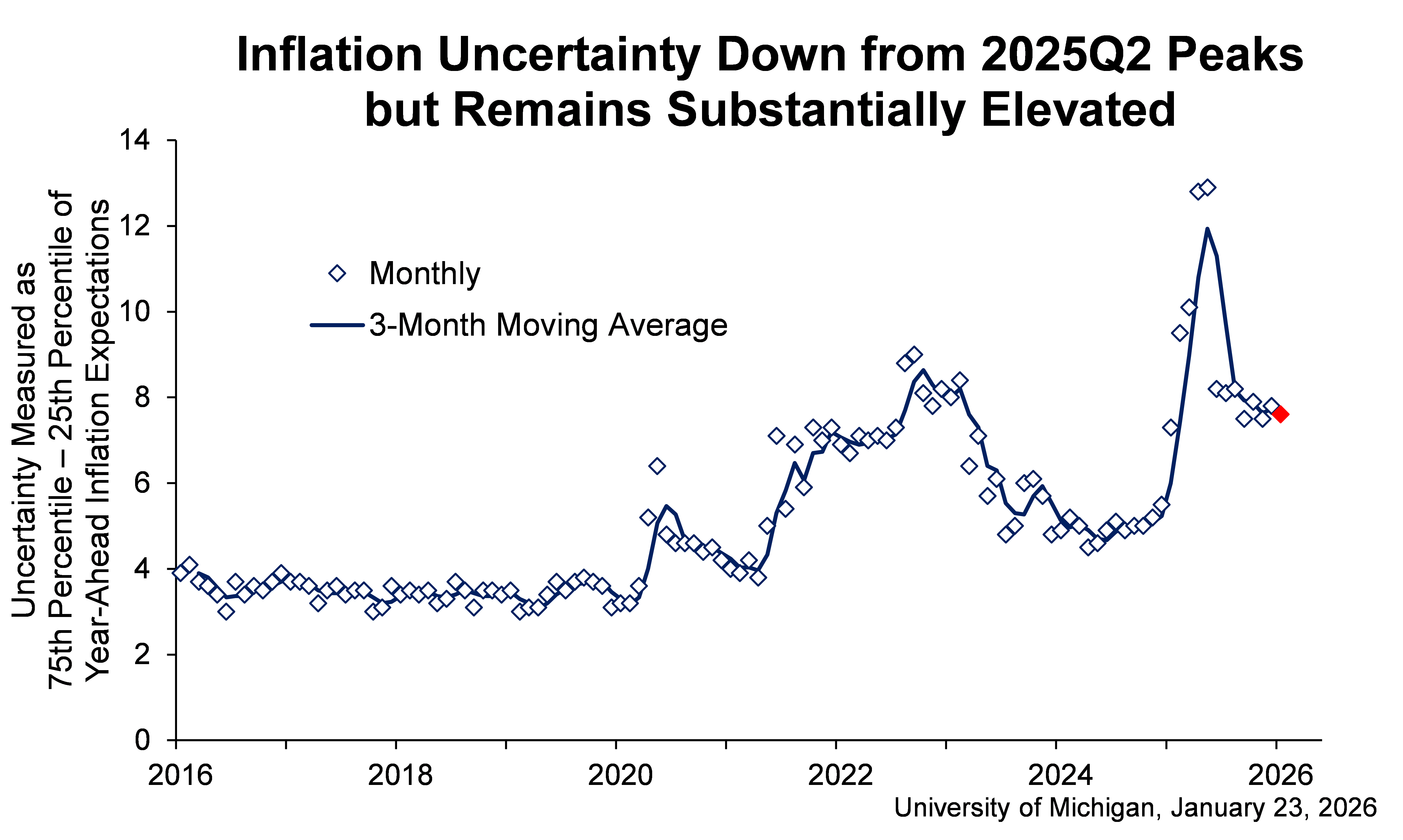 Year-ahead inflation expectations fell back to 4.0% this month. This is the lowest reading since January 2025 but remains well above that month’s 3.3%. Long-run inflation expectations inched up from 3.2% last month to 3.3% this month. In comparison, readings ranged between 2.8% and 3.2% in 2024, and were below 2.8% throughout 2019 and 2020. As seen in the chart, uncertainty over short-run inflation expectations, as measured by the interquartile range of responses, has fallen from mid-2025 but has remained considerably elevated in recent months, comparable to levels seen in 2022; see today’s special report for additional context for long-run inflation expectations.